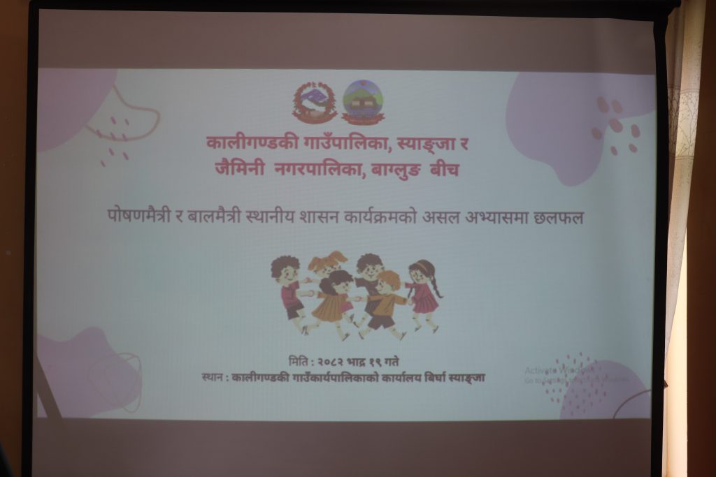 गाउँपालिकाको कार्यालयमा उपाध्यक्ष साबित्रा कोइरालाको अध्यक्षतामा सञ्चालित कार्यक्रममा जैमिनी नगरपालिकाका प्रमुख नर बहादुर पुन, वडा अध्यक्ष, कार्यालपालिका सदस्य, प्रधानाध्यापक, कर्मचारी, बाल क्लबका अध्यक्षहरुको सहभागितामा रहेको कार्यक्रममा गाउँपालिकाले विभिन्न क्षेत्रमा सञ्चालन गरेका योजनाहरुको बारेमा पावर प्वोइन्ट प्रिजेन्टसन मार्फत प्रस्तुत गरेको थियो । विशेष गरी बालमैत्री र पोषणमैत्री कार्यक्रमको अभ्यास तथा सिकाइको लागि नगरपालिकाको टोली गाउँपालिकामा आएको थियो ।